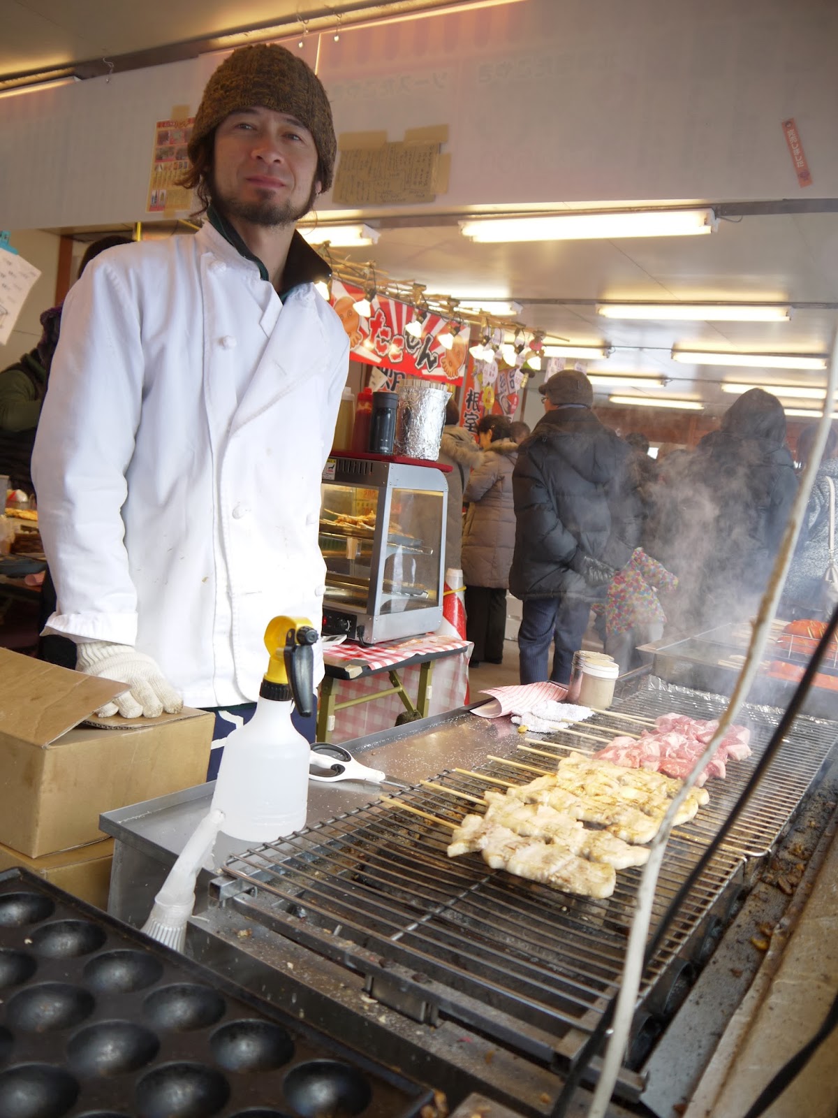 Grills cooking various kinds of food. This is a Japanese type pancake called Okonomiyaki. It consists of a batter kind of like our batter, but with added chopped cabbage, meat and other flavorings and sauces. It's yummy!